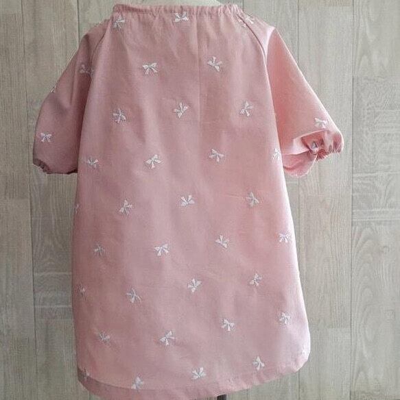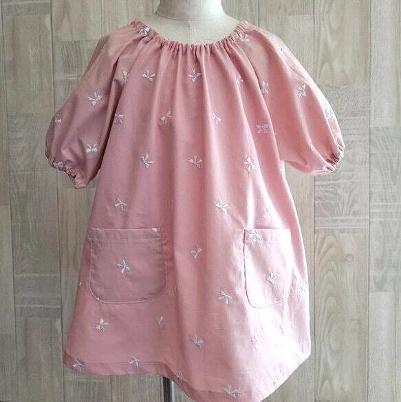 【即納120】リボン刺繍 総柄 半袖スモック 袖ゴム入り ①ライトピンク