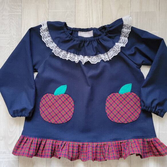 【即納100/受注80〜150】りんごポケット レッドチェック 長袖スモック 襟裾フリル