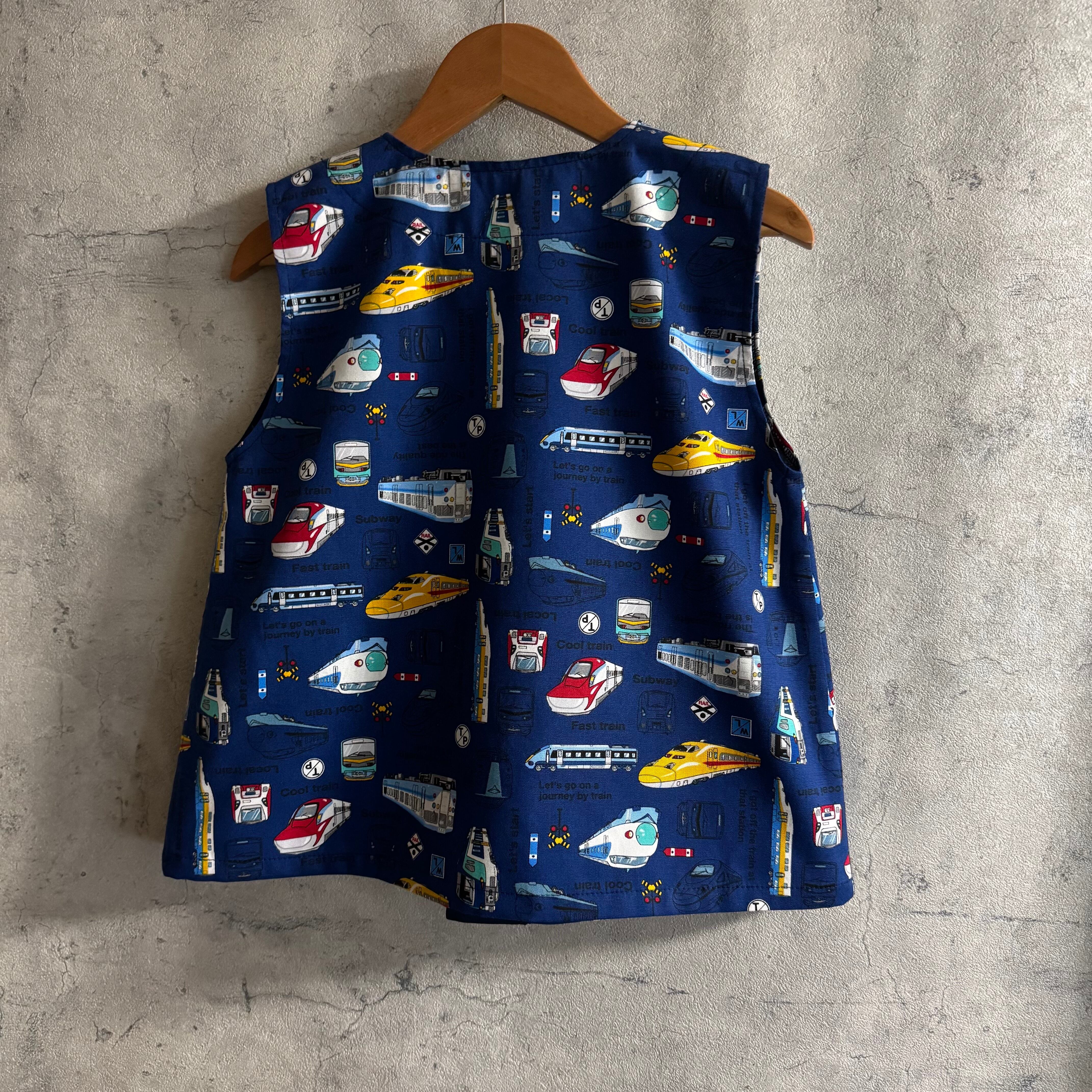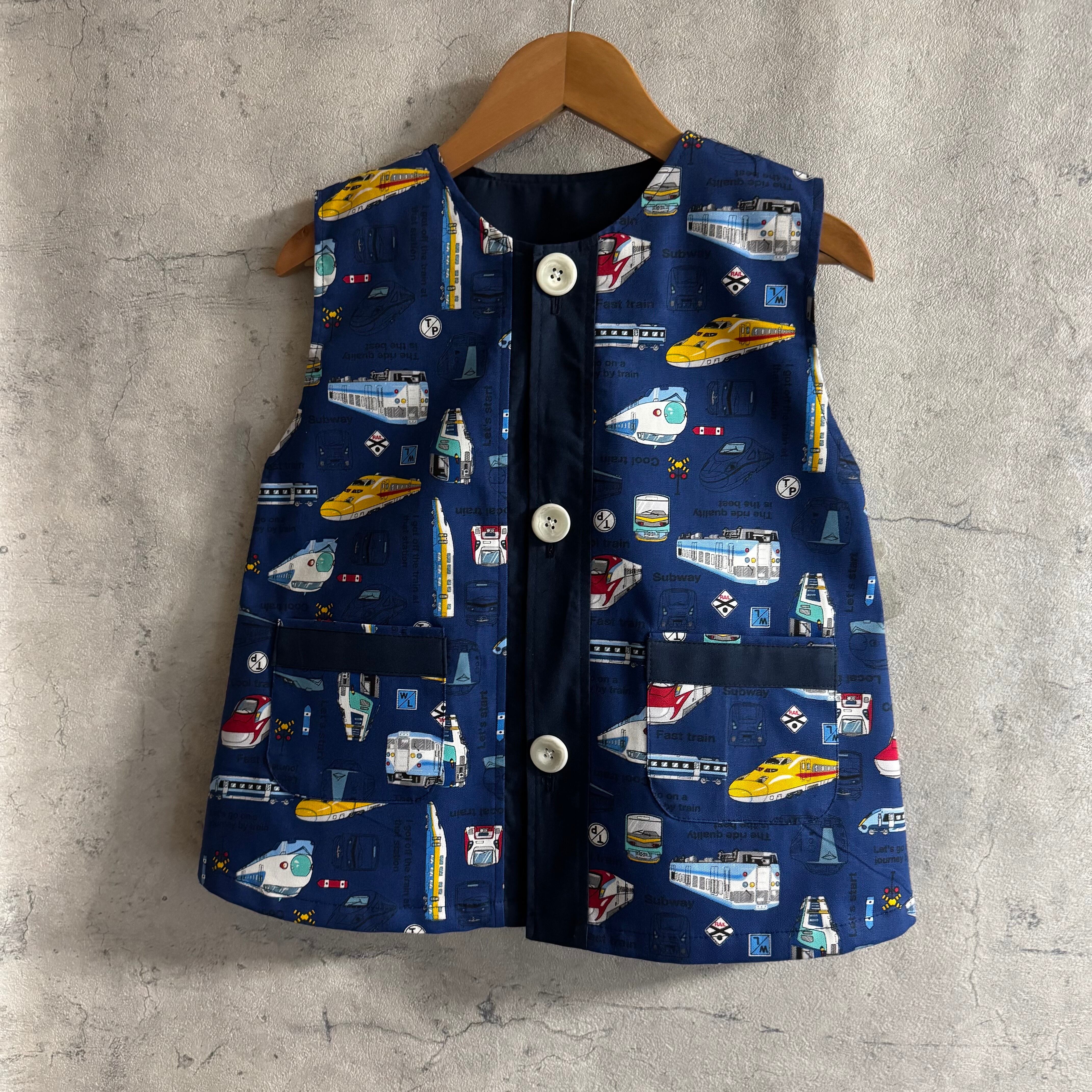 【即納120/受注80〜150】新幹線 電車 ネイビー 前ボタン 袖なしスモック ポケット上部切替