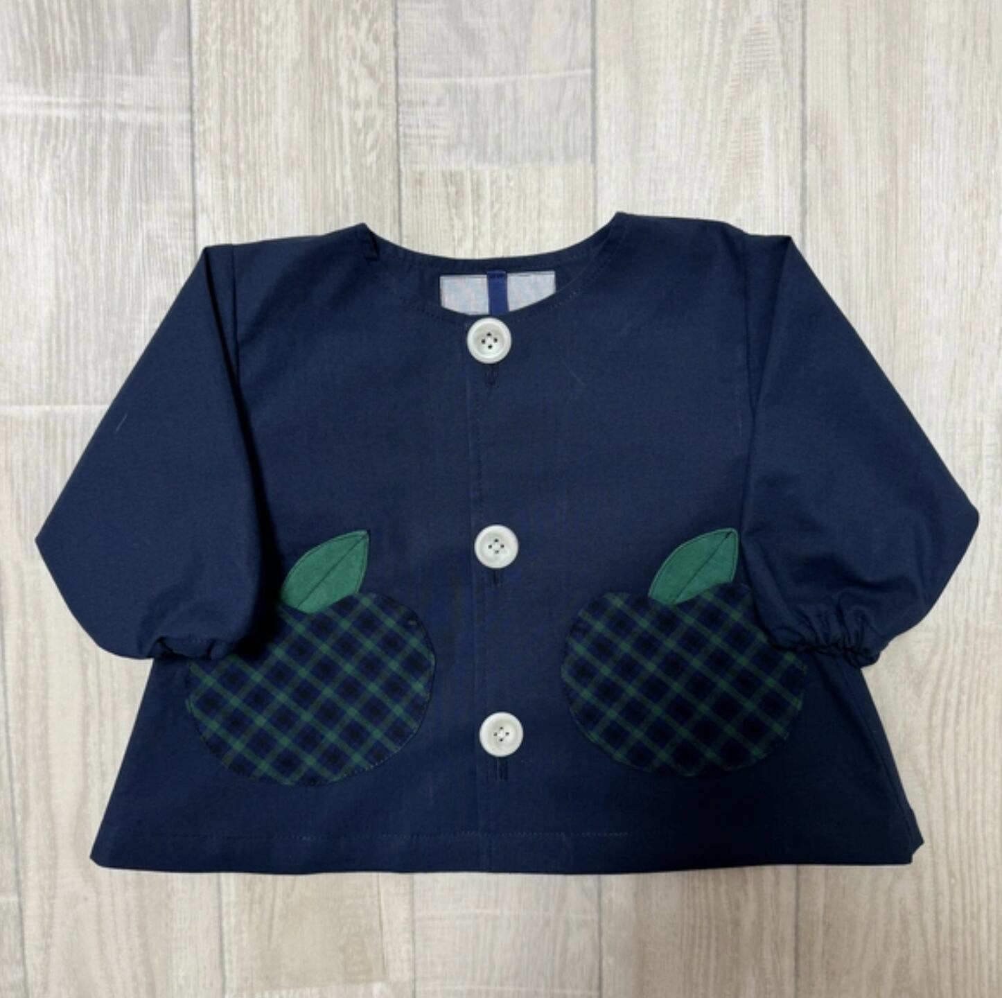 【受注80~160】りんごポケット グリーン チェック ネイビー 前ボタン 長袖スモック 着丈延長可